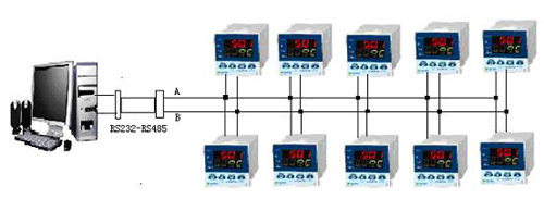 使用RS232-RS485轉(zhuǎn)換器可以很方便的連接計(jì)算機(jī)和10臺AI-501。具體方案如圖1。RS232-RS485轉(zhuǎn)換器的RS232端接到計(jì)算機(jī),所有儀表并聯(lián)在RS485的A、B端,并設(shè)置不同的地址。我設(shè)置的10臺AI-501地址分別是:1,2,3,4,5,6,7,8,9,10。