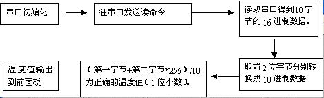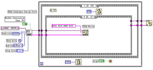 本程序的圖形代碼窗口如圖4.1和4.2。在圖形代碼窗口,為了完成對串口的初始化、寫和讀,分別用到串口初始化函數(shù)(VISA Configure Serial Port)、串口寫函數(shù)(VISA Write)和串口讀函數(shù)(VISA Read)。另外,由于得到的數(shù)據(jù)為16進(jìn)制,還用到了一些字節(jié)處理函數(shù),使之換算成10進(jìn)制顯示在程序前面板。