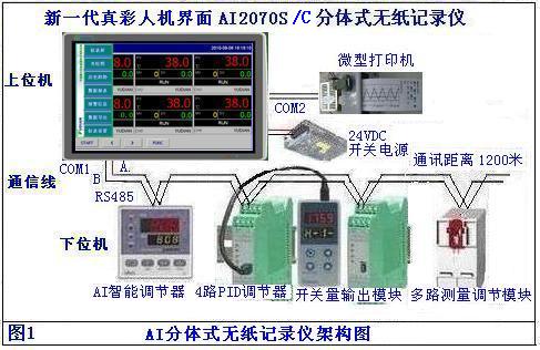 1、上位機(jī):新一代真彩人機(jī)界面AI-2070S/C分體式無紙記錄儀,使用宇電AI系列調(diào)節(jié)儀表作為測控輸入模塊實現(xiàn)多通道數(shù)字全屏顯示。測控儀表不僅包括各類溫度、壓力、等信號,也包括人工智能PID調(diào)節(jié)、可按需要配置,任意組合;