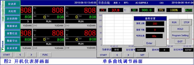 新一代真彩人機(jī)界面AI-2070S/C分體式無紙記錄儀,通過RS485通訊接口,能方便地與AI智能程序型PID溫度調(diào)節(jié)器配合使用。在電爐程序控溫時在人機(jī)觸摸屏上可顯示雙曲線運行圖;