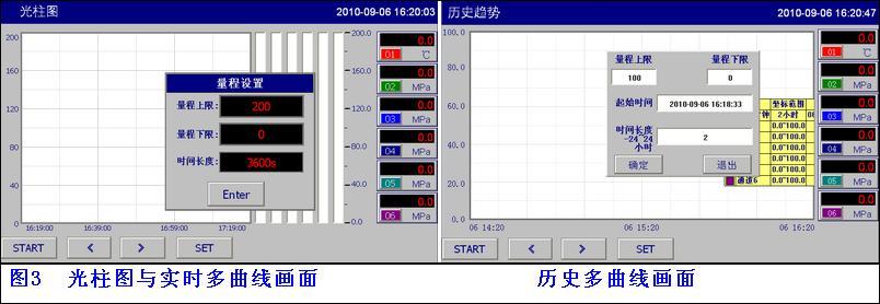計算機(jī)的操作方式:軟件界面有固定的觸摸按鍵點:開機(jī)全屏顯示數(shù)據(jù)畫面,點擊【START】按鍵,進(jìn)入菜單點擊功能鍵如:【儀表屏】、【光柱圖】、【歷史趨勢】、【數(shù)據(jù)報表】、【報警信息】、【數(shù)據(jù)導(dǎo)出】、【儀表設(shè)置】;控制程序的【啟動】【暫?!俊就V埂康裙潭ǖ牟僮鞣椒?。
